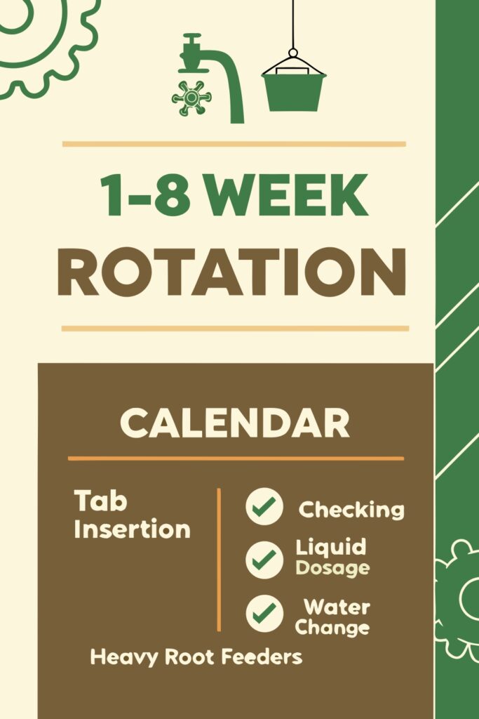 This rotation ensures heavy feeders get root tab attention every 4–8 weeks while you maintain weekly oversight.